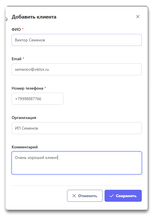 Нажмите "Сохранить", чтобы добавить клиента в базу данных.