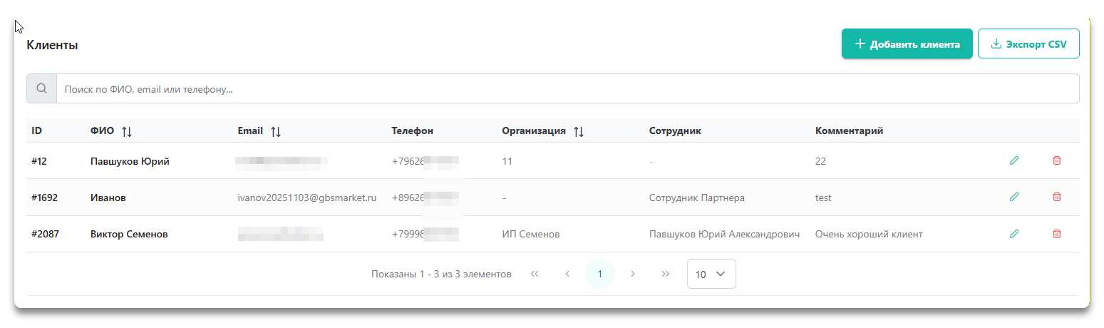 Раздел клиенты позволяет просматривать информацию о клиентах партнера