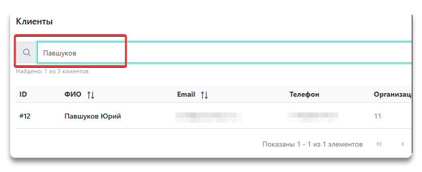 Над списком клиентов есть поле "Поиск". Введите часть ФИО, электронной почты или телефона, чтобы найти клиента.