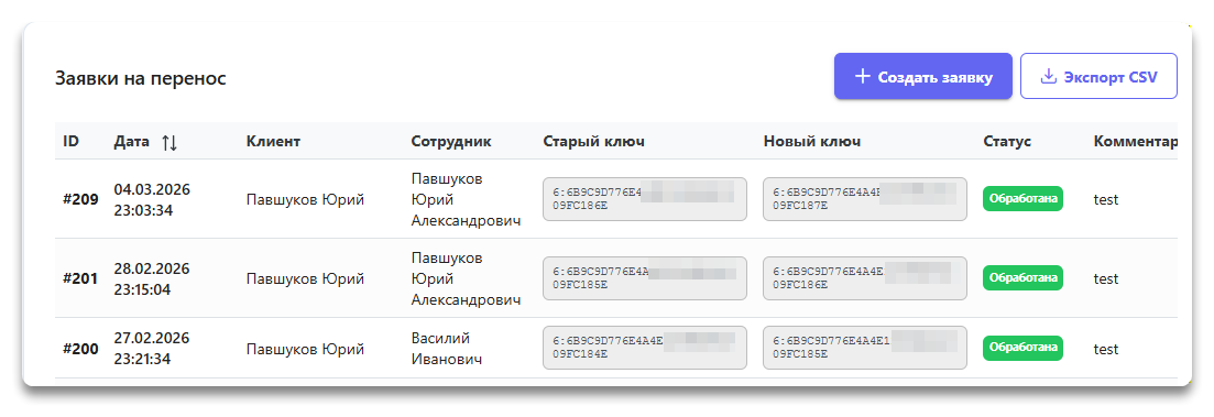 - Старый ключ - ИД, с которого выполнялся перенос