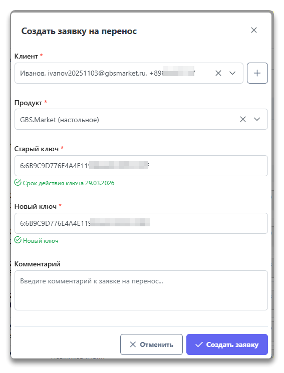 Чтобы выполнить перенос лицензии, нажмите кнопку Создать заявку